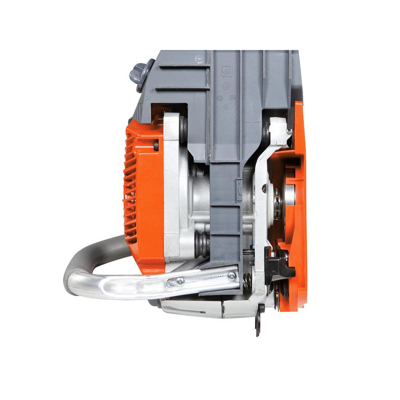 La machine intègre des fonctionnalités pratiques comme le système Easy-Start, le Primer pour un démarrage facilité à froid, un système anti-vibration, un filtre à air accessible sans outil et un tendeur de chaîne latéral pour un entretien rapide.